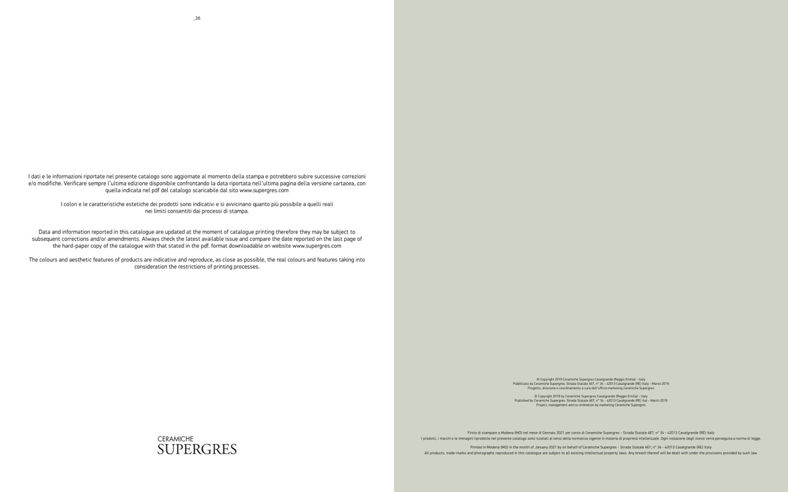 Printed in Modena (MO) in the month of January 2021 by on behalf of Ceramiche Supergres - Strada Statale 467, n° 34 - 42013 Casalgrande (RE) Italy