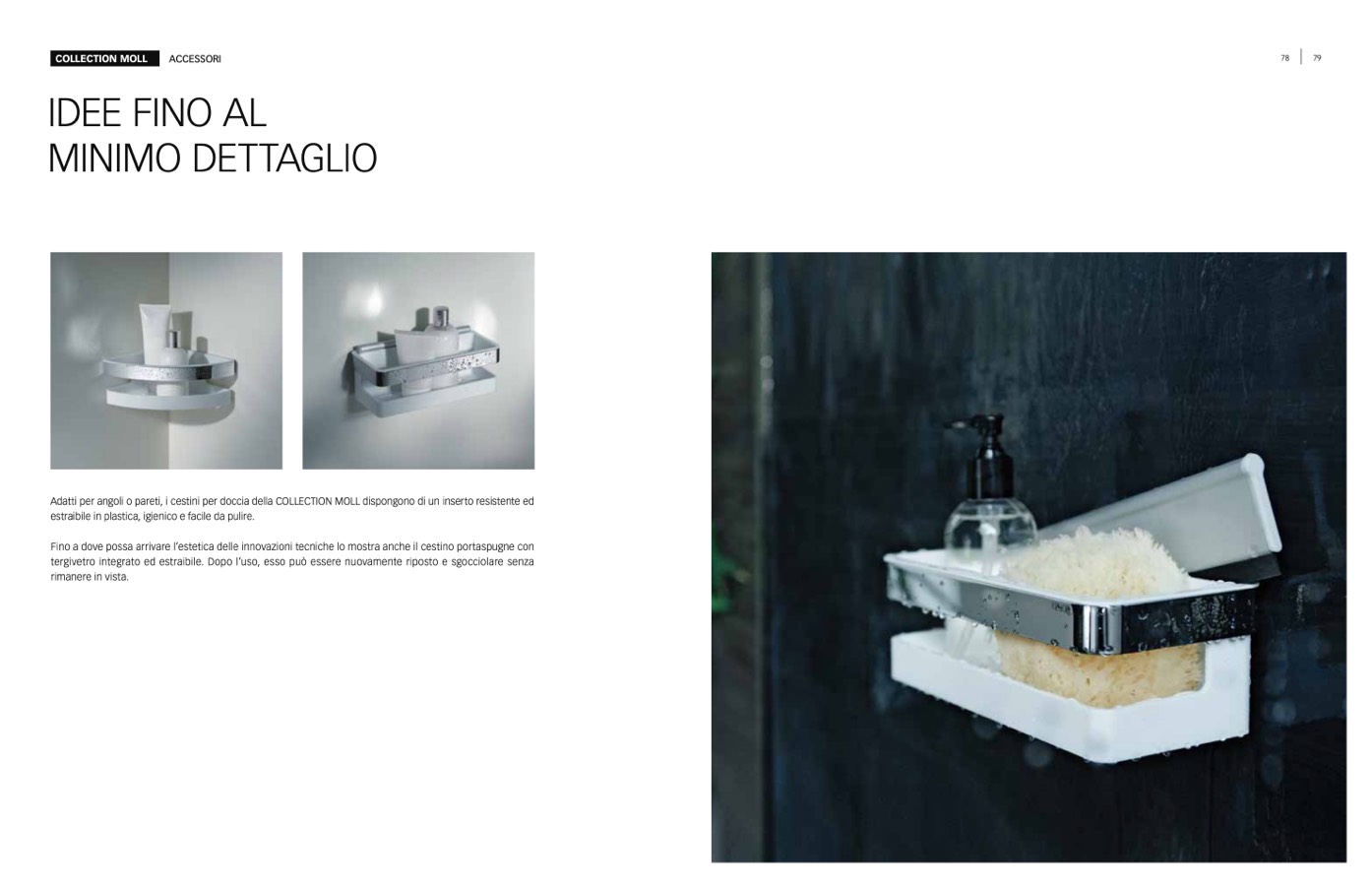 Adatti per angoli o pareti, i cestini per doccia della COLLECTION MOLL dispongono di un inserto resistente ed