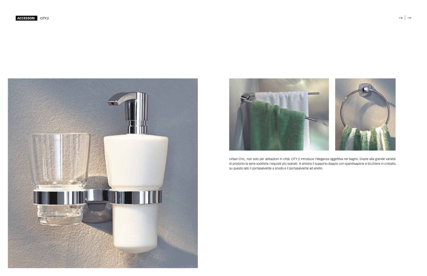 di prodotto la serie soddisfa i requisiti più svariati. A sinistra il supporto doppio con spandisapone e bicchiere in cristallo,