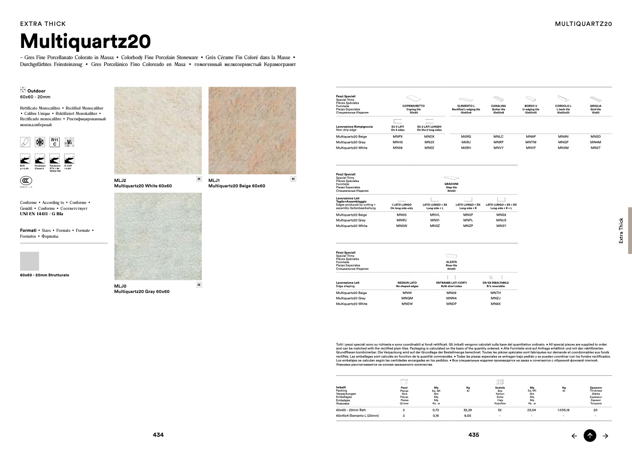 Tutti i pezzi speciali sono su richiesta e sono coordinabili ai fondi rettificati. Gli imballi vengono calcolati sulla base del quantitativo ordinato. • All special pieces are supplied to order