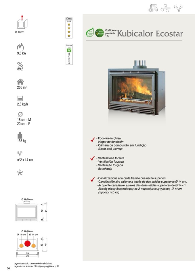 - Canalización aire caliente a través de dos salidas superiores Ø 14 cm.