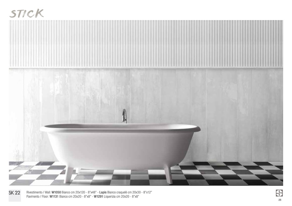 Rivestimento / Wall: W1050 Bianco cm 20x120 - 8”x48” - Lapis Bianco craquelè cm 20x30 - 8”x12”