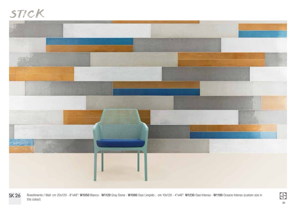 Rivestimento / Wall: cm 20x120 - 8”x48”: W1050 Bianco - W1120 Gray Stone - W1090 Oasi Limpido ; cm 10x120 - 4”x48”: W1230 Oasi Intenso - W1190 Oceano Intenso (custom size in