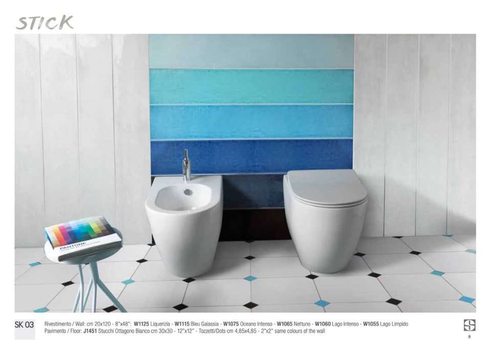Rivestimento / Wall: cm 20x120 - 8”x48”: W1125 Liquerizia - W1115 Bleu Galassia - W1075 Oceano Intenso - W1065 Nettuno - W1060 Lago Intenso - W1055 Lago Limpido