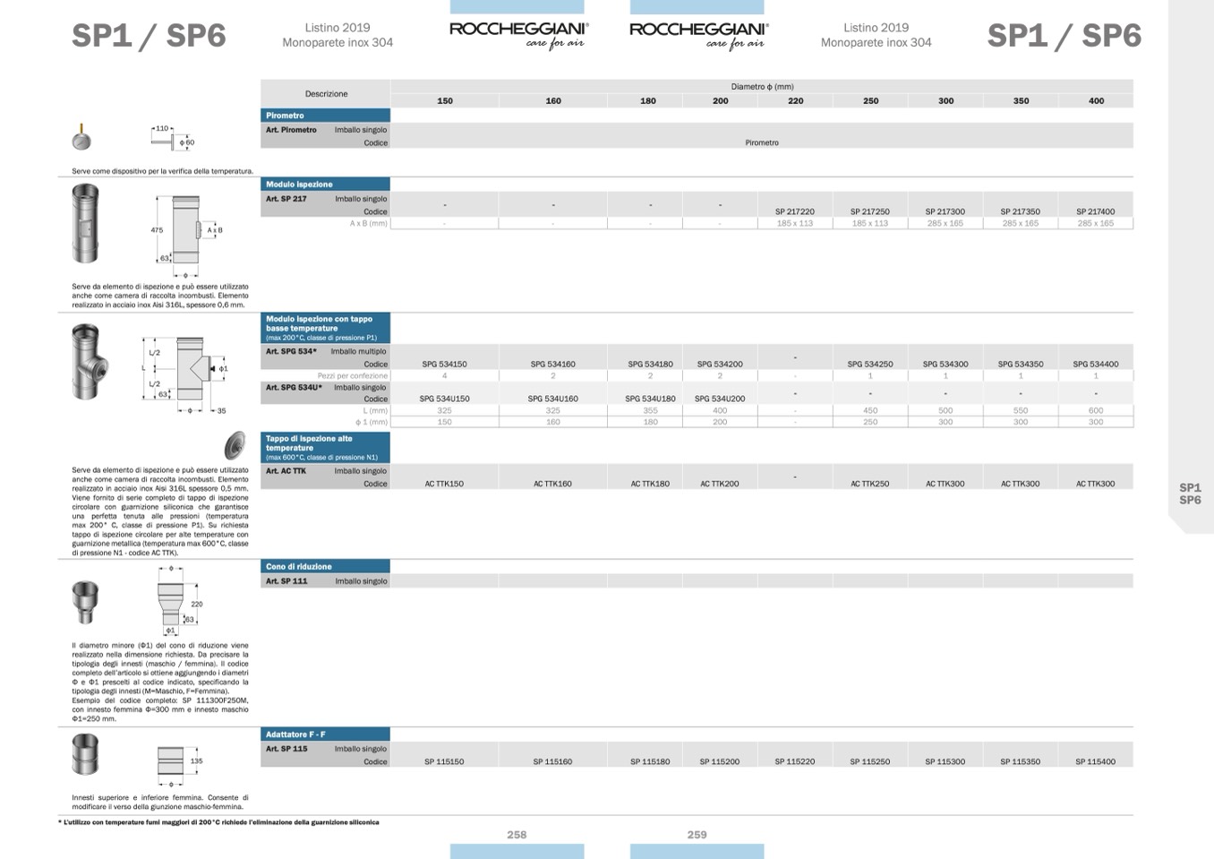 * L’utilizzo con temperature fumi maggiori di 200°C richiede l’eliminazione della guarnizione siliconica