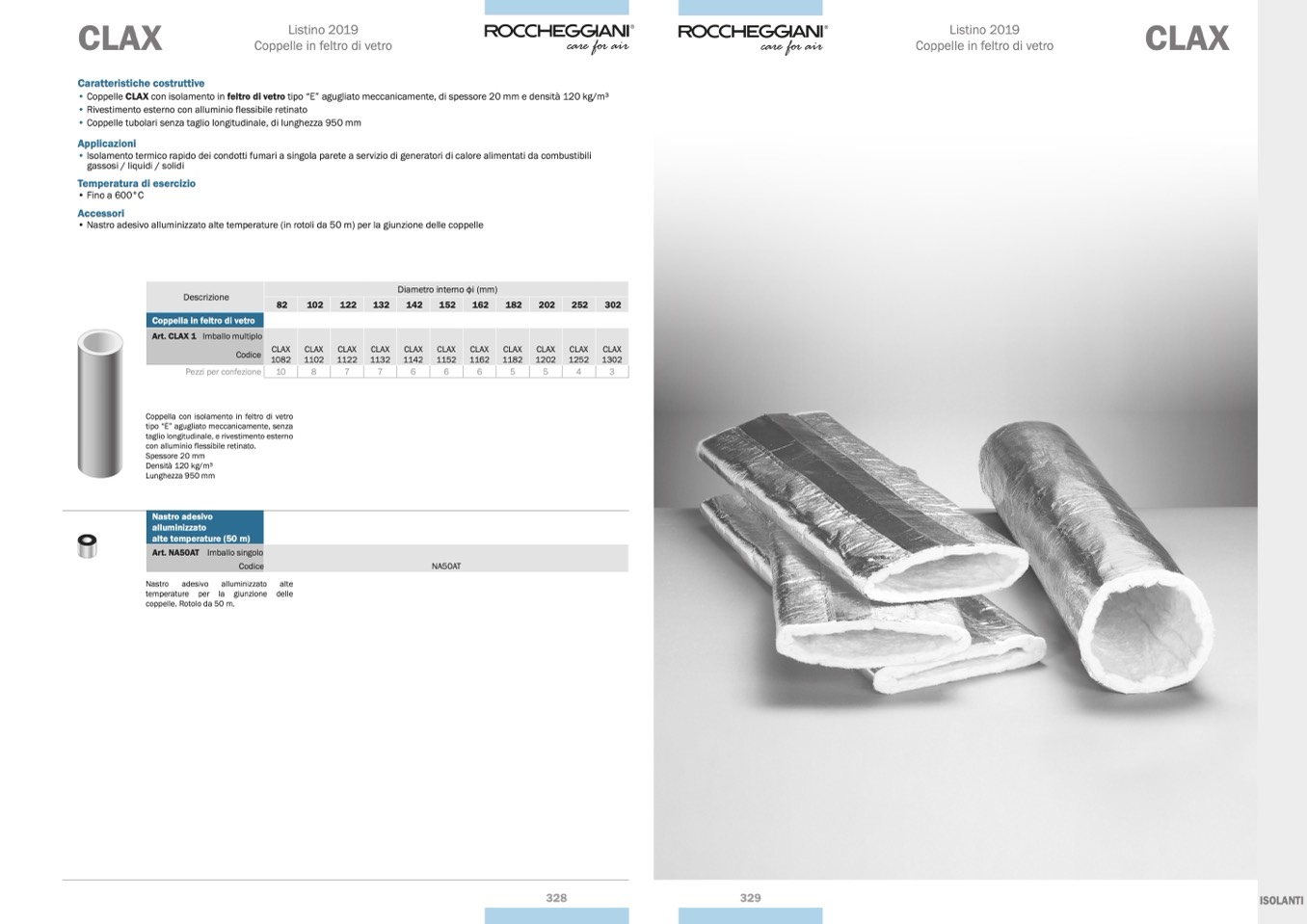 • Coppelle CLAX con isolamento in feltro di vetro tipo “E” agugliato meccanicamente, di spessore 20 mm e densità 120 kg/m3
