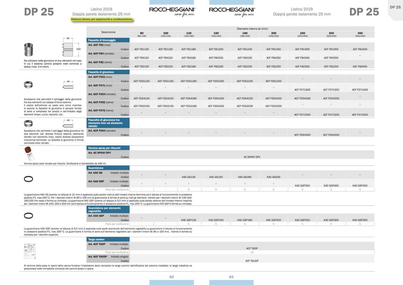 in pressione positiva P1, max 200°C. La guarnizione è fornita di serie sull’elemento regolabile per i diametri interni Фi 80 e 100 mm, mentre è fornita su