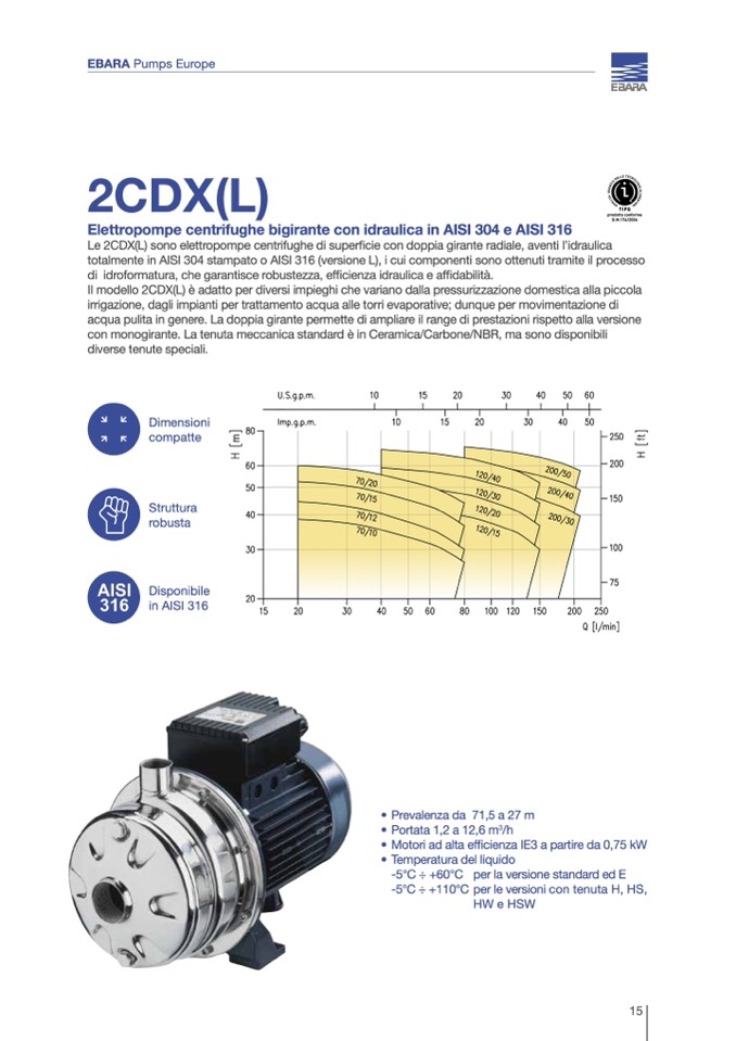 Le 2CDX(L) sono elettropompe centrifughe di superficie con doppia girante radiale, aventi l’idraulica