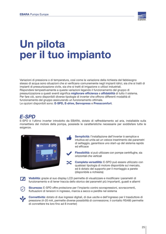 E-SPD è l’ultimo inverter introdotto da EBARA, dotato di raffreddamento ad aria, installabile sulla