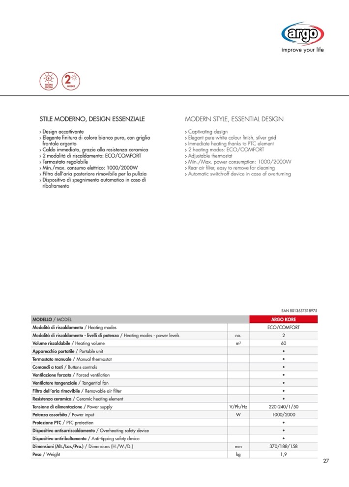 2 modalità di riscaldamento: ECO/COMFORT