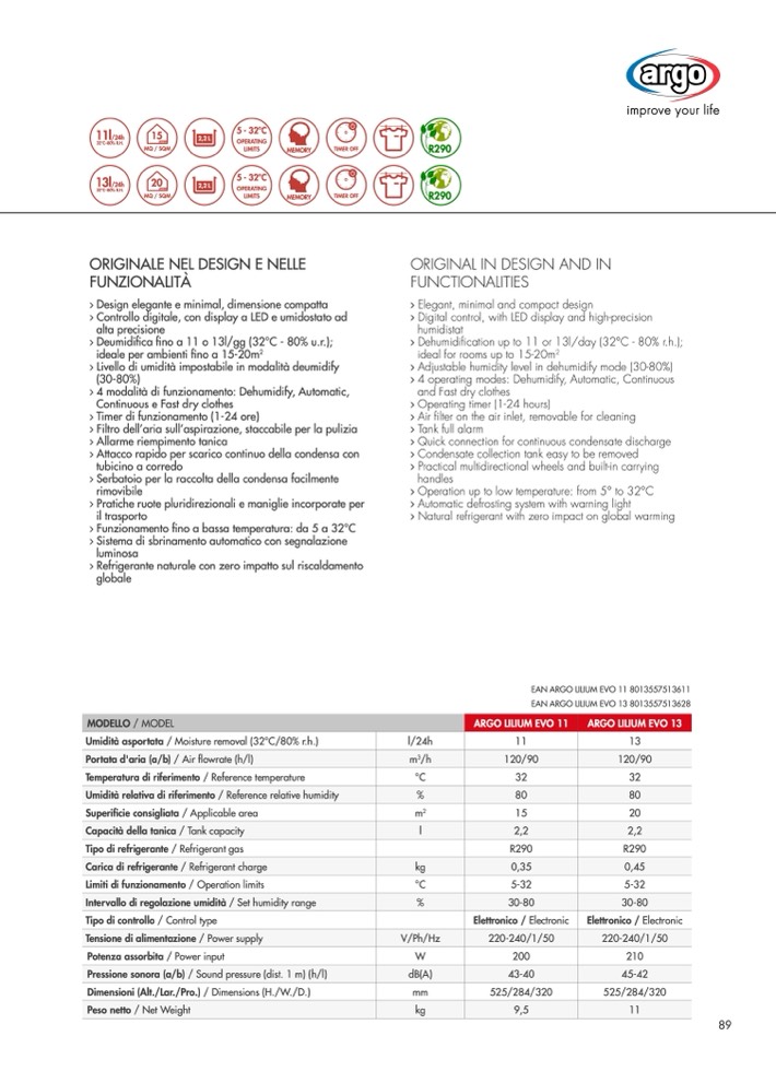 Dehumidification up to 11 or 13l/day (32°C - 80% r.h.);
