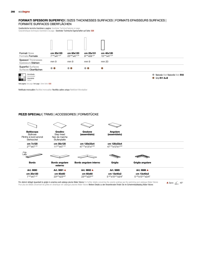 Per ulteriori dettagli riguardanti le griglie in ceramica vedi catalogo piscine Water Visions For further details concerning the ceramic gratings see the swimming pool catalogue Water Visions