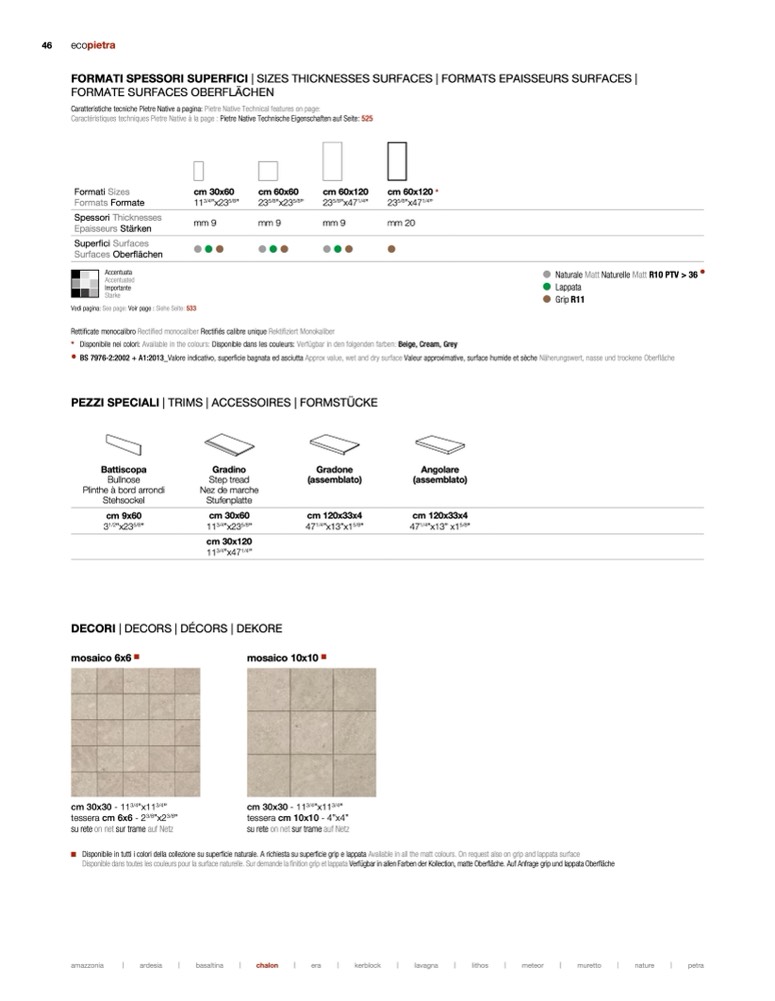 Disponible dans toutes les couleurs pour la surface naturelle. Sur demande la finition grip et lappata Verfügbar in allen Farben der Kollection, matte Oberfläche. Auf Anfrage grip und lappata Oberfl