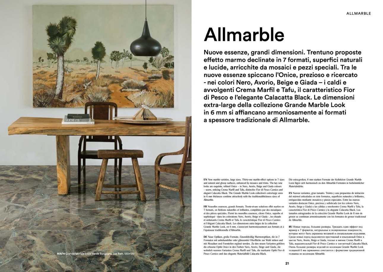EN New marble varieties, large sizes. Thirty-one marble-effect options in 7 sizes