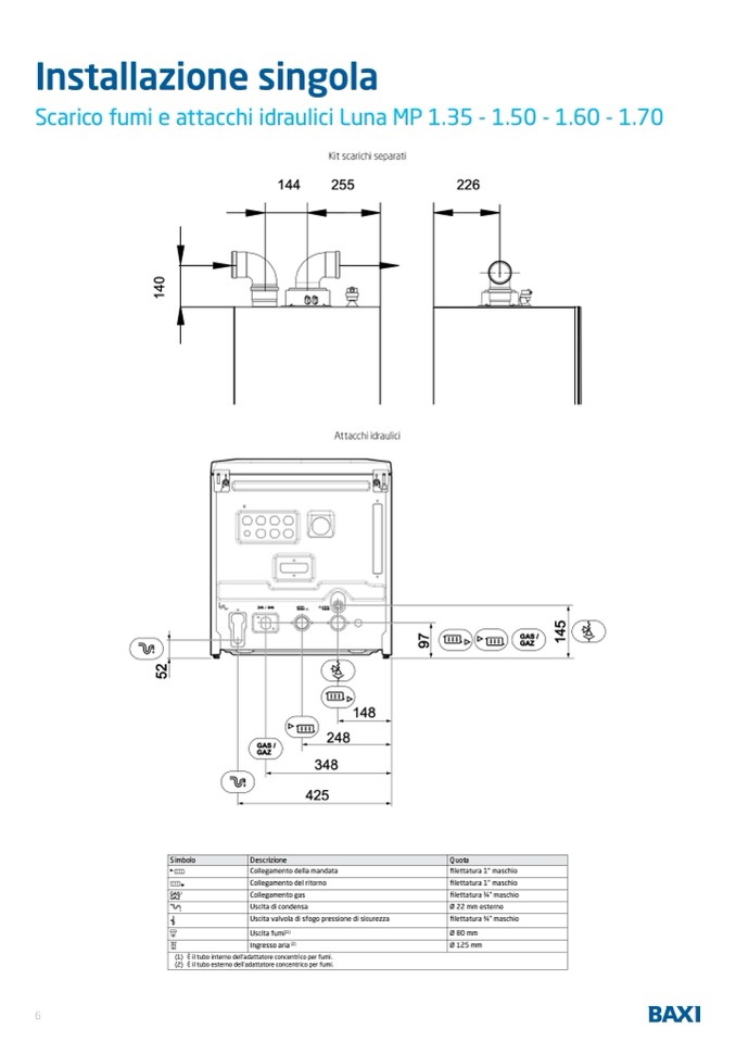 Scarico fumi e attacchi idraulici Luna MP 1.35 - 1.50 - 1.60 - 1.70