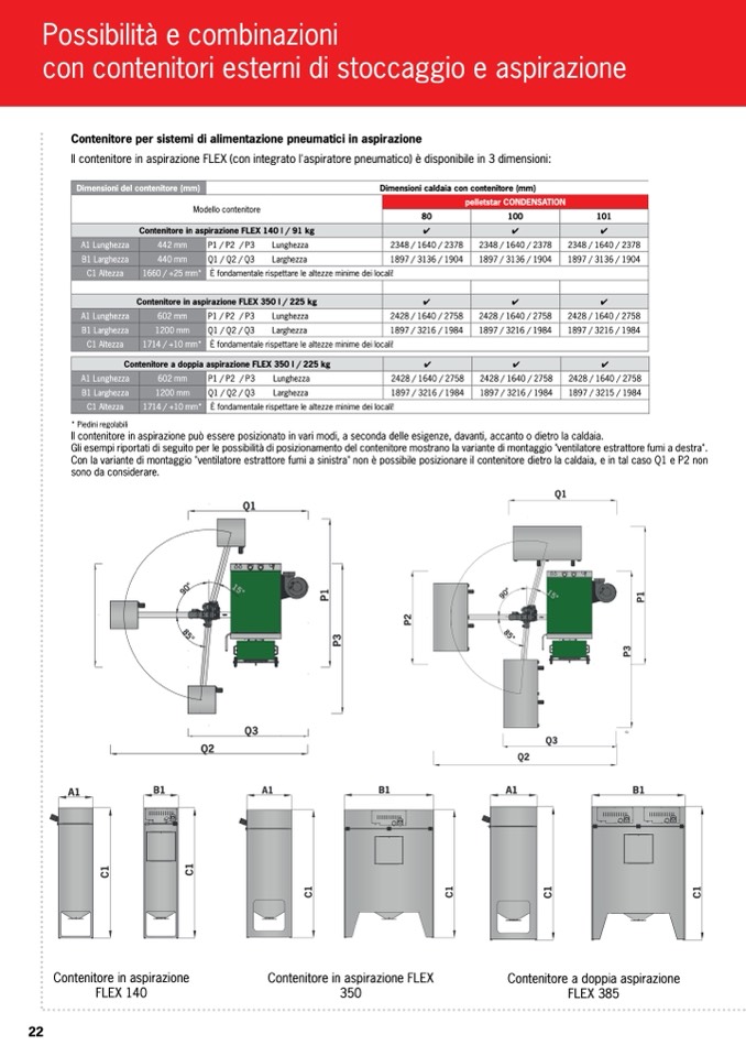 Il contenitore in aspirazione può essere posizionato in vari modi, a seconda delle esigenze, davanti, accanto o dietro la caldaia.