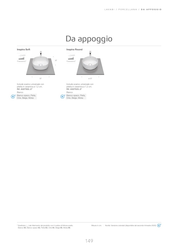 Bianco 00, Bianco opaco 62, Perla 63, Onix 64, Beige 65, Moka 66 .