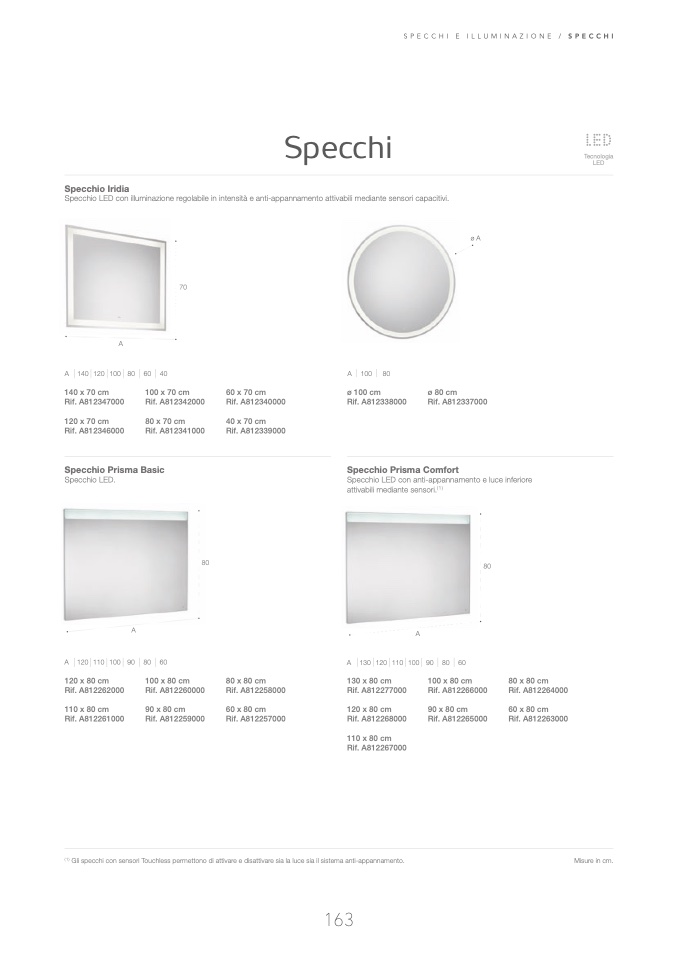 Specchio LED con illuminazione regolabile in intensità e anti-appannamento attivabili mediante sensori capacitivi .