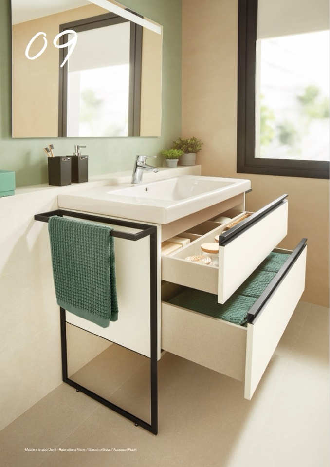 Mobile e lavabo Domi / Rubinetteria Malva / Specchio Eidos / Accessori Rubik