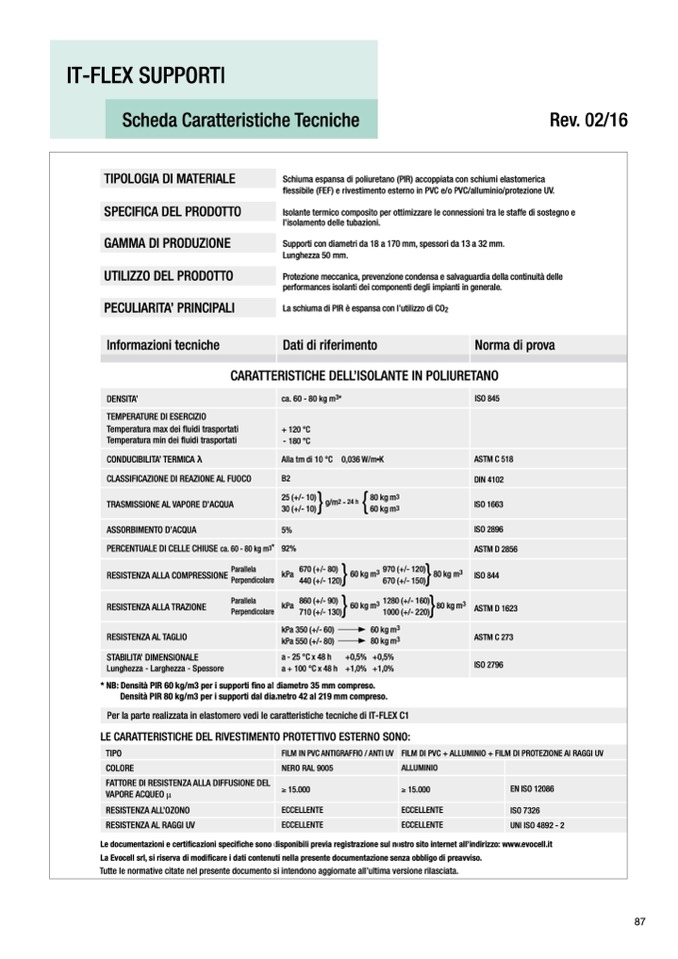 * NB: Densità PIR 60 kg/m3 per i supporti fino al diametro 35 mm compreso.
