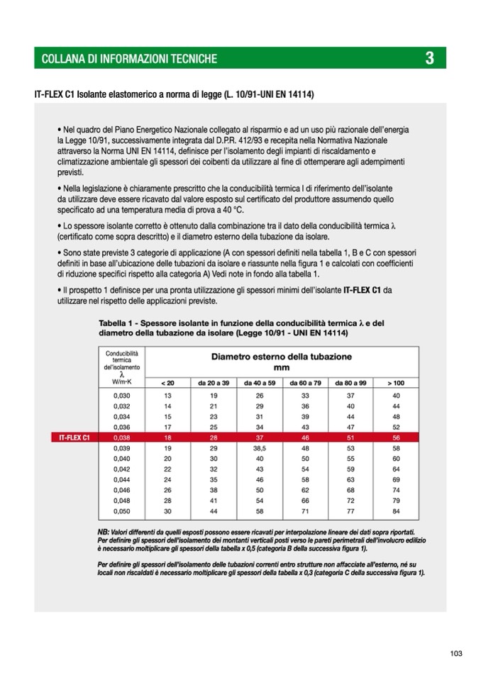 • Il prospetto 1 definisce per una pronta utilizzazione gli spessori minimi dell’isolante IT-FLEX C1 da