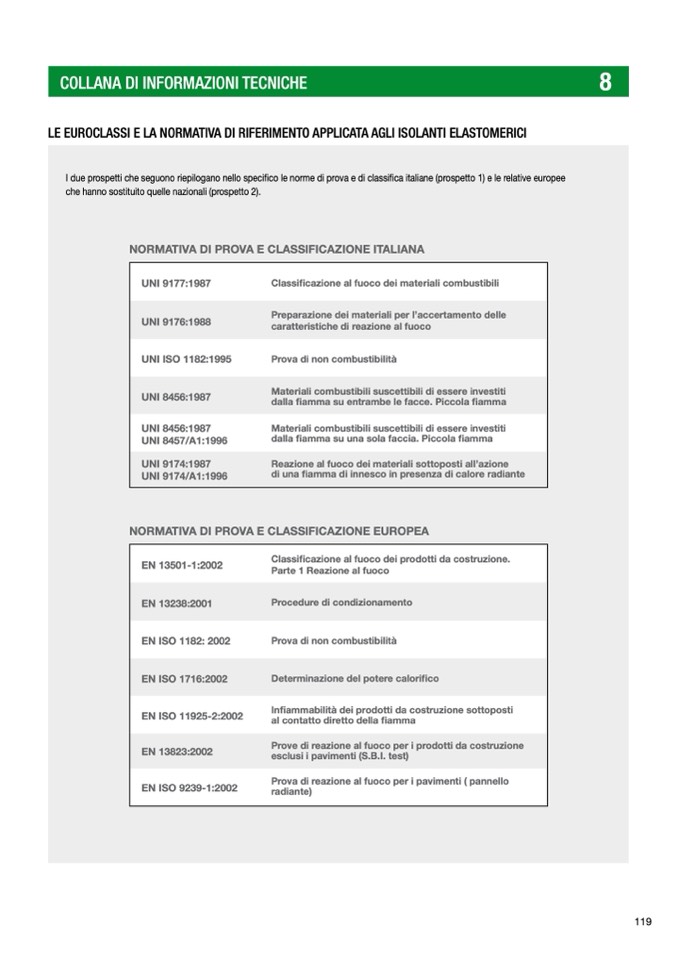 I due prospetti che seguono riepilogano nello specifico le norme di prova e di classifica italiane (prospetto 1) e le relative europee