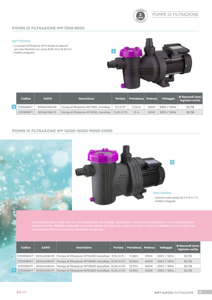 la circolazione dell’acqua di piscine domestiche di ogni tipo.