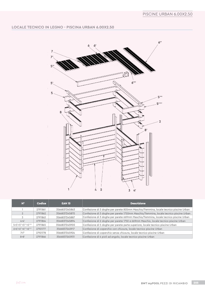 Confezione di 5 doghe per parete parte superiore, locale tecnico piscine Urban