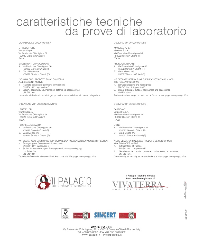 Le caratteristiche tecniche dei singoli prodotti sono reperibili sul sito: www.palagio.it/ce