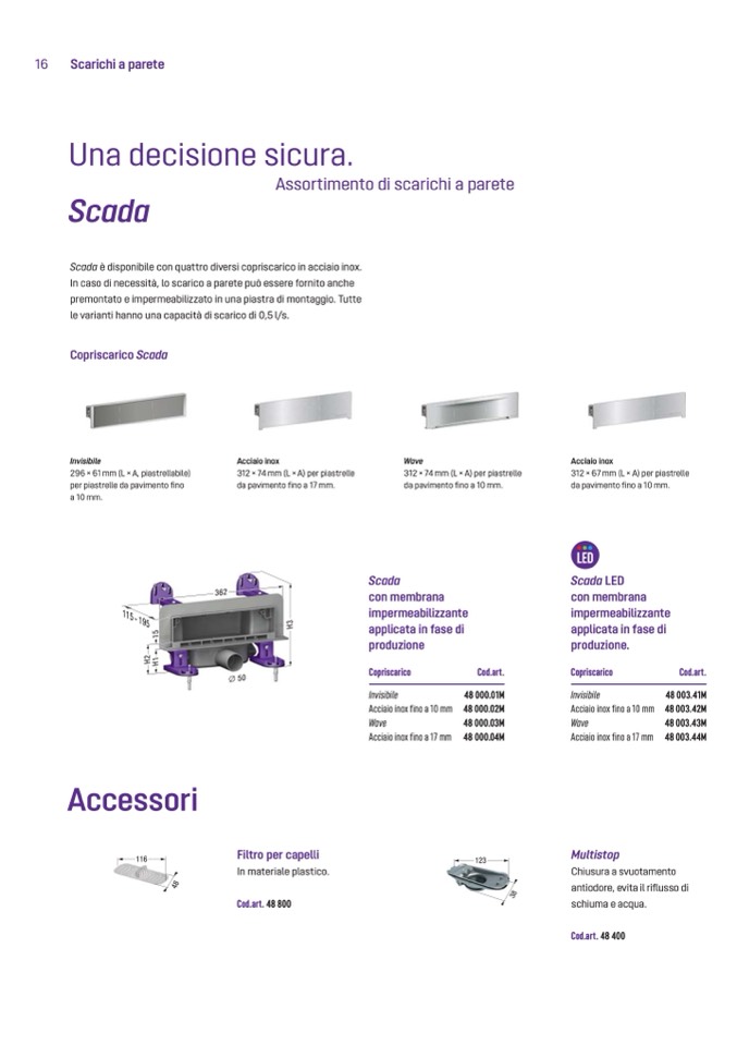 Scada è disponibile con quattro diversi copriscarico in acciaio inox.
