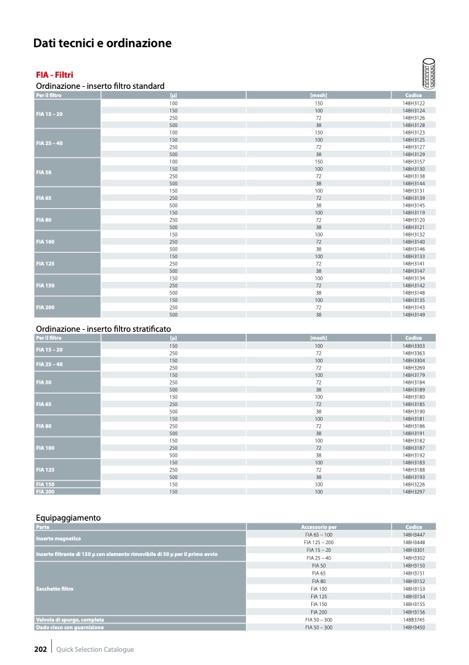 Inserto filtrante di 150 μ con elemento rimovibile di 50 μ per il primo avvio