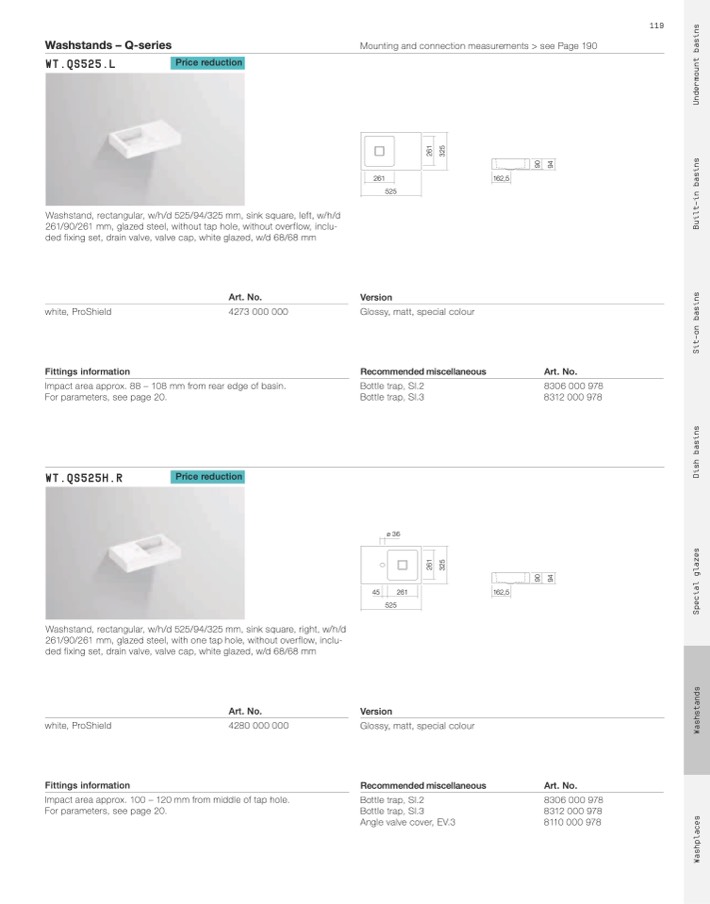 Washstand, rectangular, w/h/d 525/94/325 mm, sink square, left, w/h/d