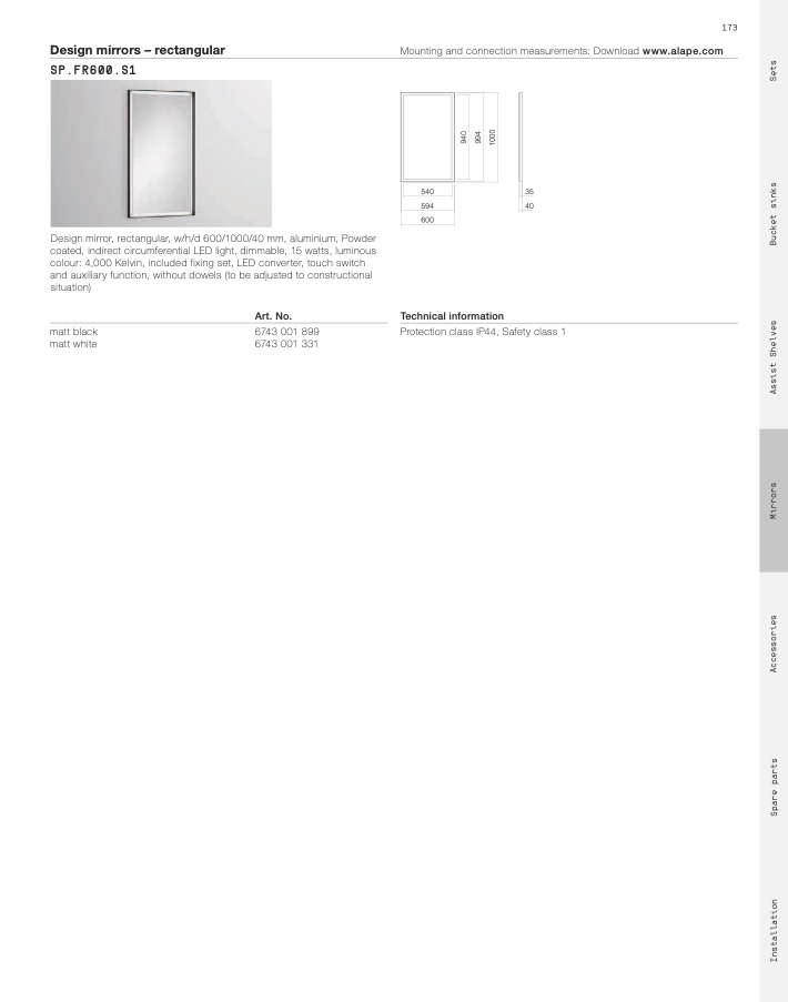 Design mirror, rectangular, w/h/d 600/1000/40 mm, aluminium, Powder