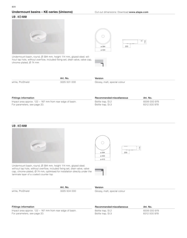Undermount basin, round, Ø 394 mm, height 114 mm, glazed steel,