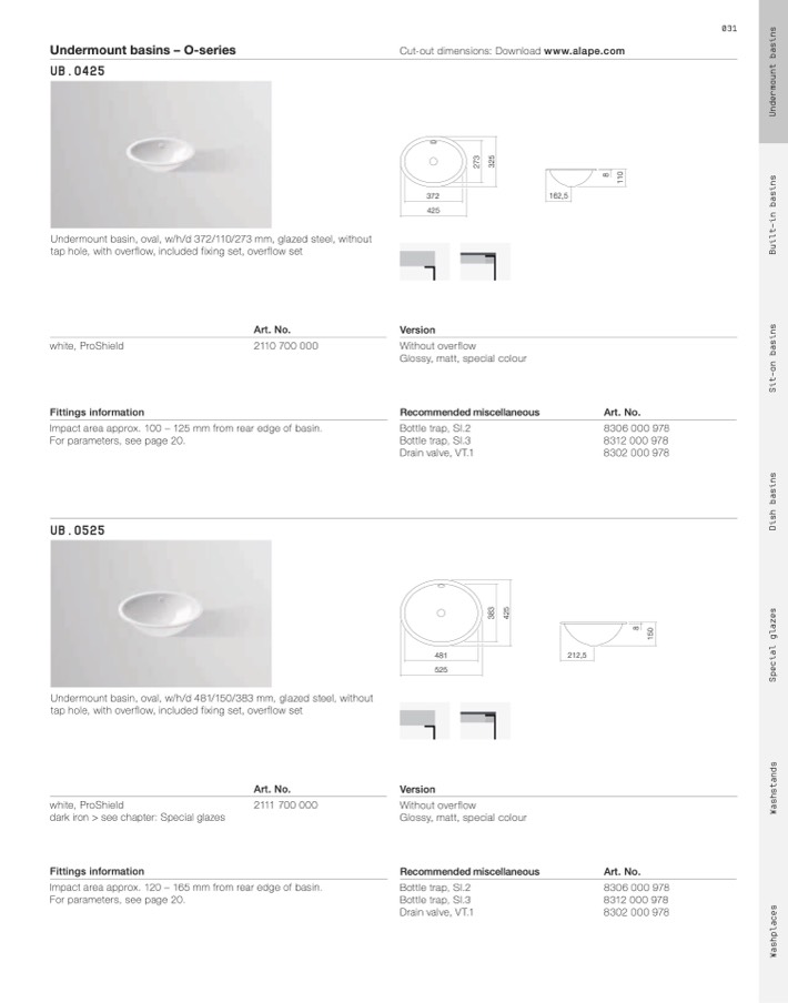 Undermount basin, oval, w/h/d 372/110/273 mm, glazed steel, without