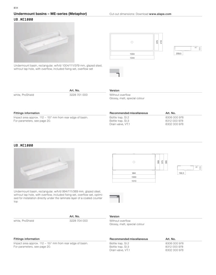Undermount basin, rectangular, w/h/d 1004/111/379 mm, glazed steel,