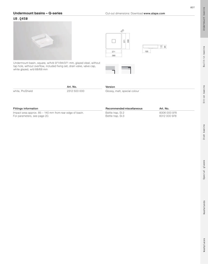Undermount basin, square, w/h/d 371/94/371 mm, glazed steel, without