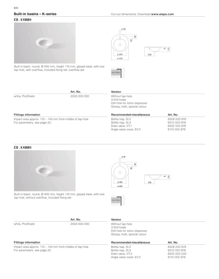 Built-in basin, round, Ø 400 mm, height 110 mm, glazed steel, with one