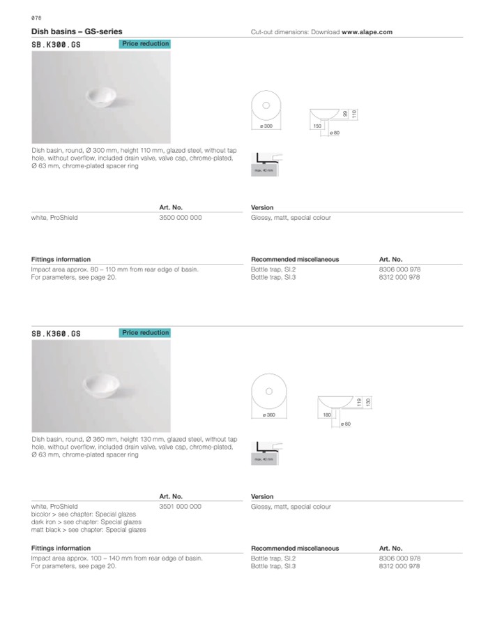 Dish basin, round, Ø 300 mm, height 110 mm, glazed steel, without tap
