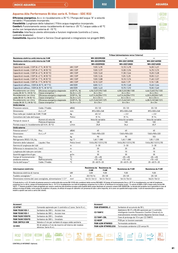 1) Scala da A+++ a D. 2) Livello di potenza sonora in conformità alla norma EN 12102 alle condizioni della norma EN14825. 3) Campo di funzionamento fino a -25 °C in riscaldamento con tubi di lunghezz