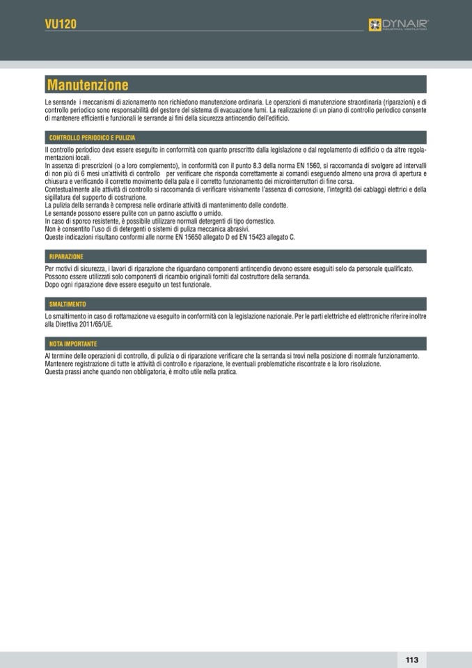 Le serrande i meccanismi di azionamento non richiedono manutenzione ordinaria. Le operazioni di manutenzione straordinaria (riparazioni) e di