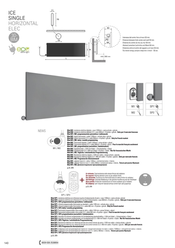 Mod SP1: infrared programmable thermostat as standard + cable 1200 mm + schuko plug + glicole