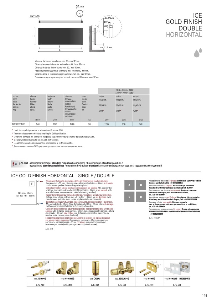 Interasse min = 50 mm, interasse max = altezza del radiatore – 86 mm, a richiesta,