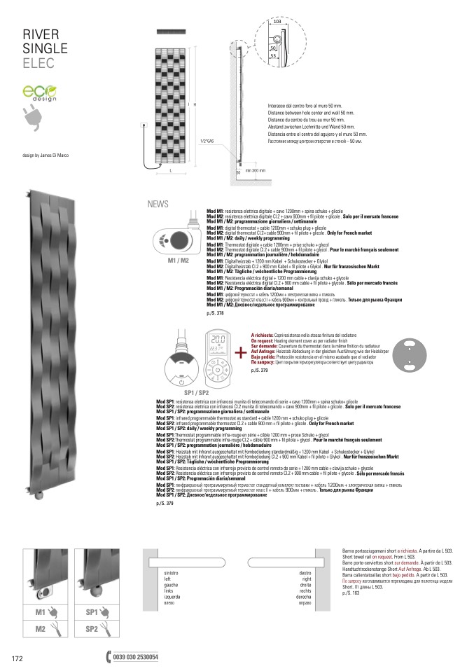 Mod SP1: infrared programmable thermostat as standard + cable 1200 mm + schuko plug + glicole