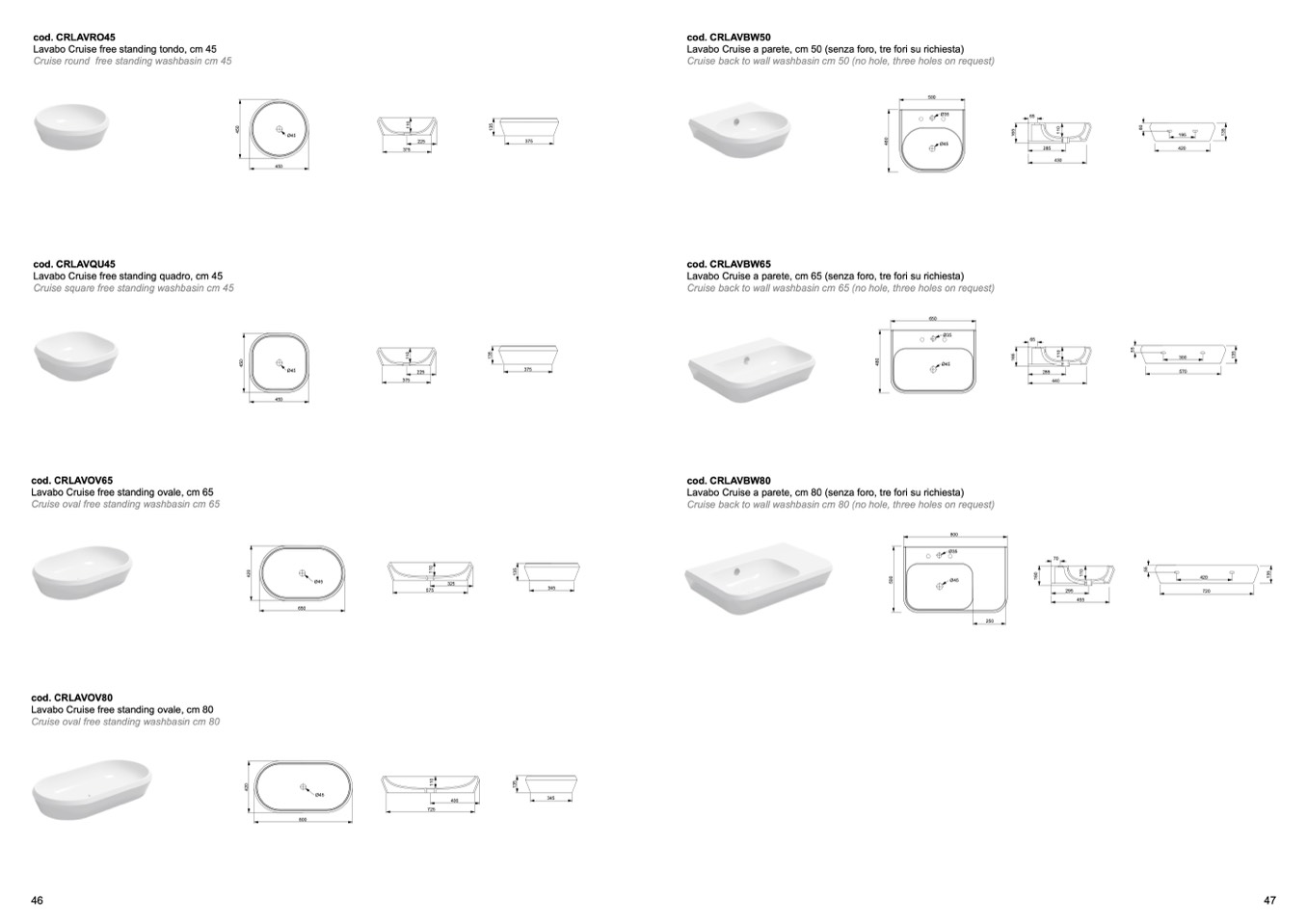 Cruise back to wall wØa4s5hbasin cm 65 (no hole, three holes on request)