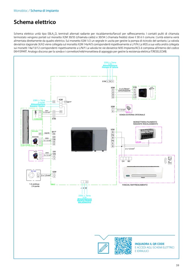 Schema elettrico unità tipo EBLA_D, terminali alternati radiante per riscaldamento/fancoil per raffrescamento. I contatti puliti di chiamata