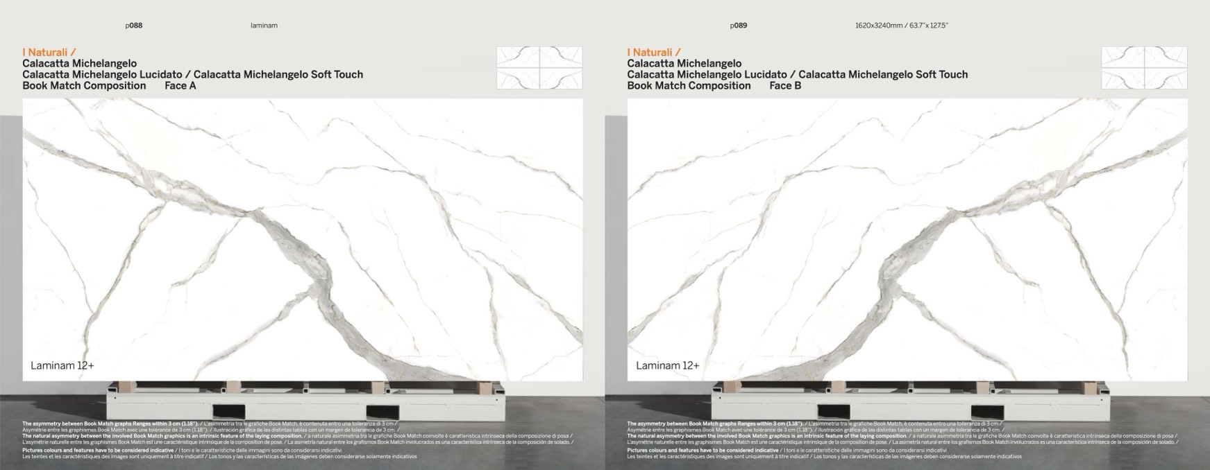 The asymmetry between Book Match graphs Ranges within 3 cm (1.18”). / L’asimmetria tra le grafiche Book Match, è contenuta entro una tolleranza di 3 cm /