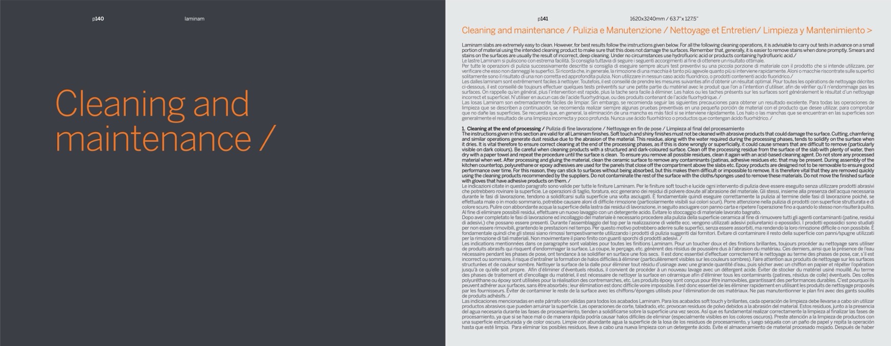 The instructions given in this section are valid for all Laminam finishes. Soft touch and shiny finishes must not be cleaned with abrasive products that could damage the surface. Cutting, chamfering