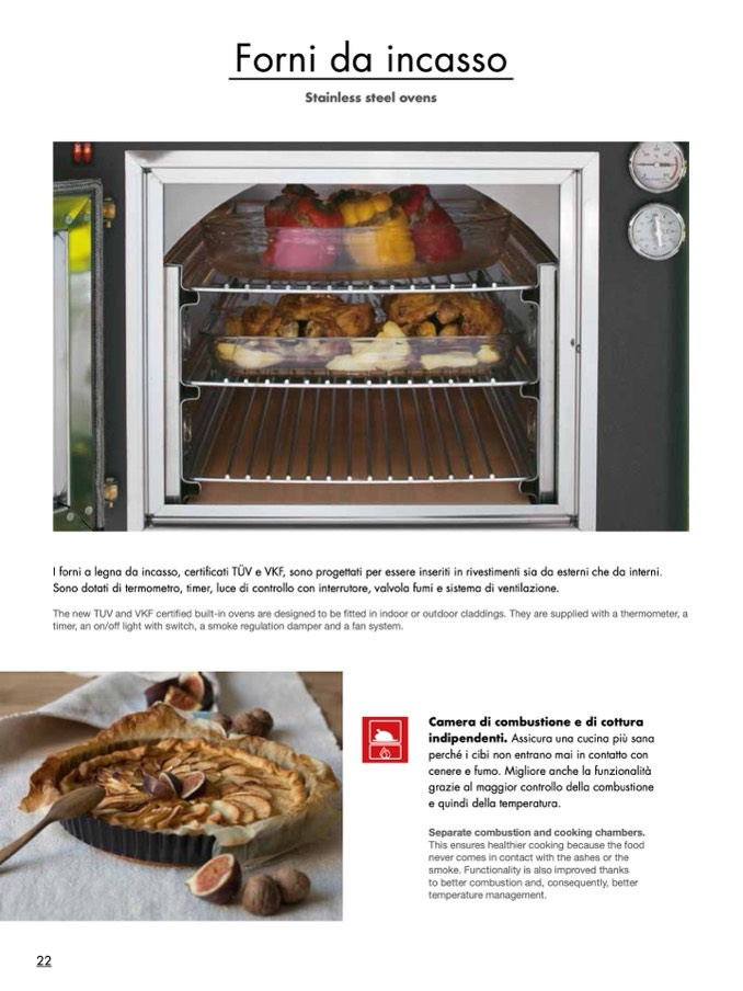 The new TUV and VKF certified built-in ovens are designed to be fitted in indoor or outdoor claddings. They are supplied with a thermometer, a