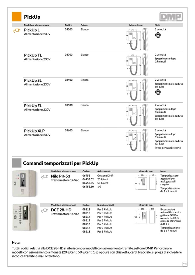 Tutti i codici relativi alla DCE 28-HD si riferiscono ai modelli con azionamento tramite gettone DMP. Per ordinare